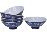 Elegant Blue and White Cherry Blossom and Maple Leaf Japanese Rice Bowl Set for Five