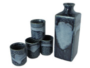 Metallic Grey with Black Speckle Chrysanthemum Japanese Saki Set for Four